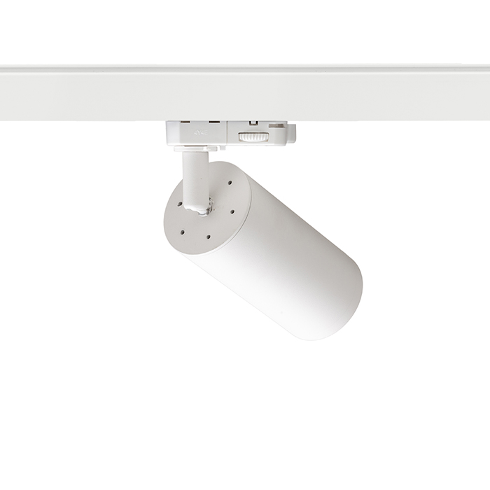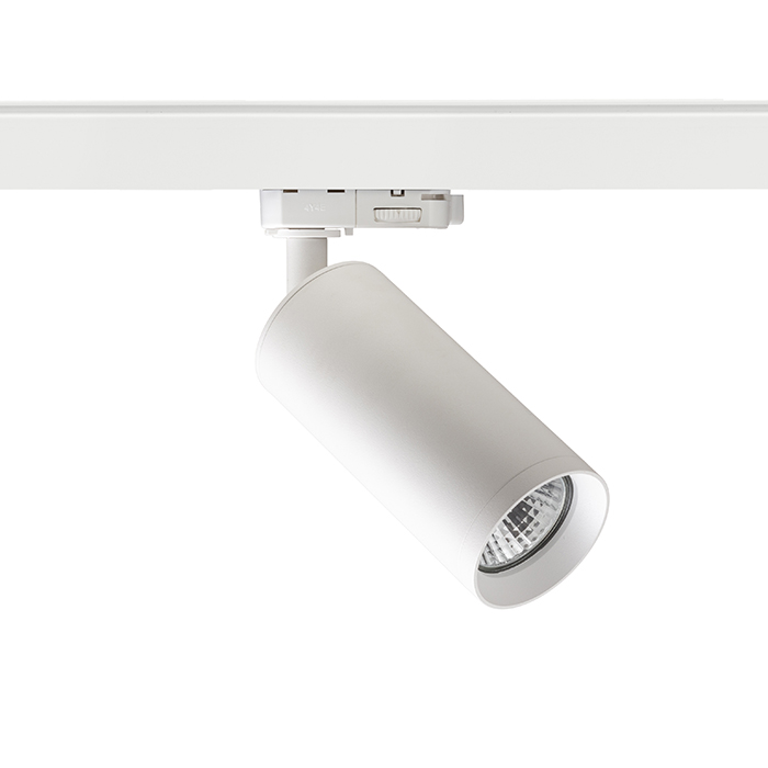 Egyszerû henger alakú reflektor GU10 foglalattal háromáramkörös sínre. A rugóval ellátott talpazat lehetõvé teszi a különbözõ hosszúságú izzók használatát.