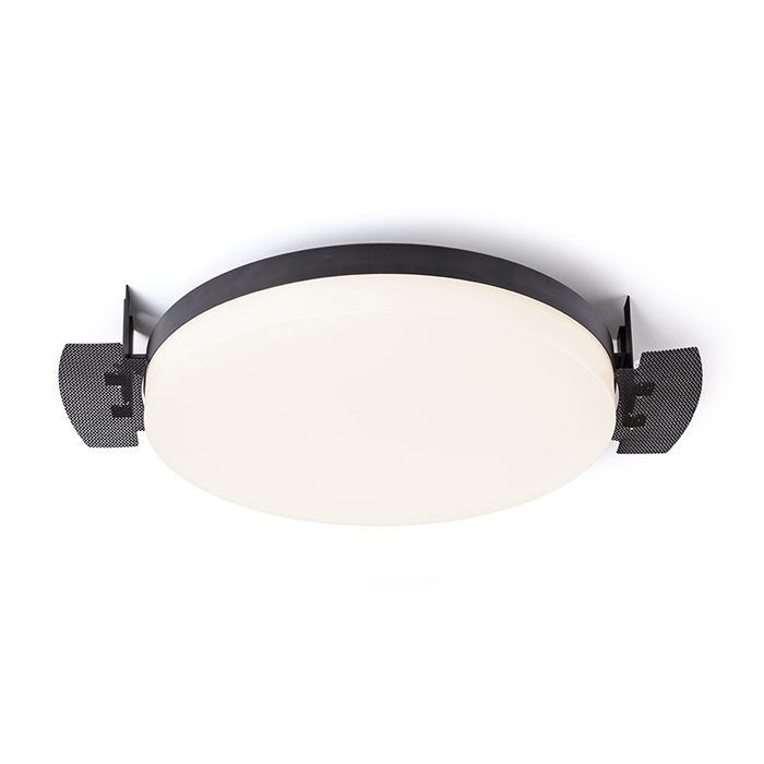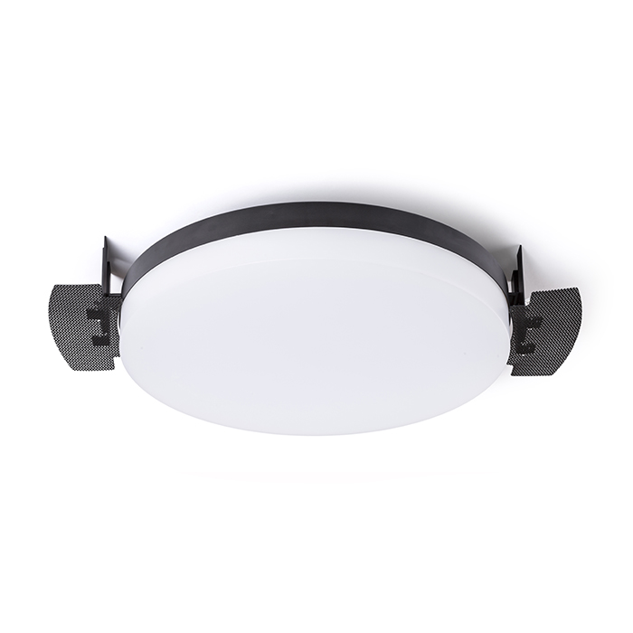 Süllyesztett kör alakú LED lámpa gipszkarton mennyezetbe történõ felszereléshez állítható magasságú tartóval.