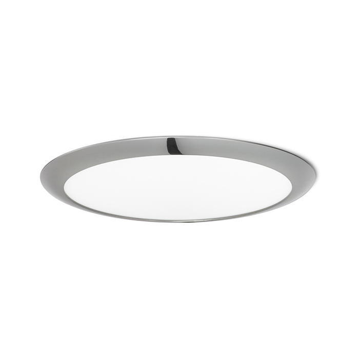 Kerek süllyesztett LED lámpa gipszkarton mennyezetekhez lekerekített kerettel és alacsony süllyesztési mélységgel.
