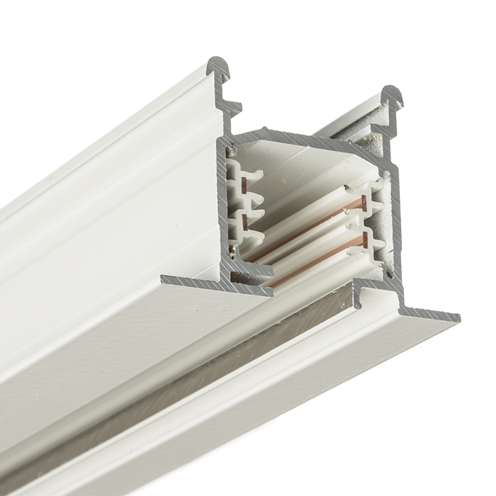 Háromáramkörös süllyesztett EUTRAC sínrendszer extrudált alumínium profilból amely egyben földelésként is szolgál. A belsejében két beépített mûanyag profil található amelyekben négy darab 25 mm átmérõjû rézvezeték fut. Bármely profilt könnyedén méretre lehet vágni. A vezetékek végeit nem szükséges levágni vagy meghajlítani. Halogén fényforrások használata esetén a minimális felszerelési magasság 25 m. Ennél alacsonyabb belmagasság esetén LED fényforrásokat javaslunk.