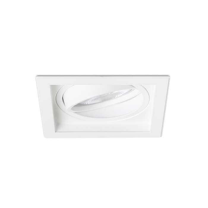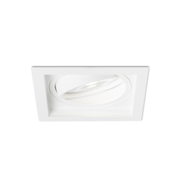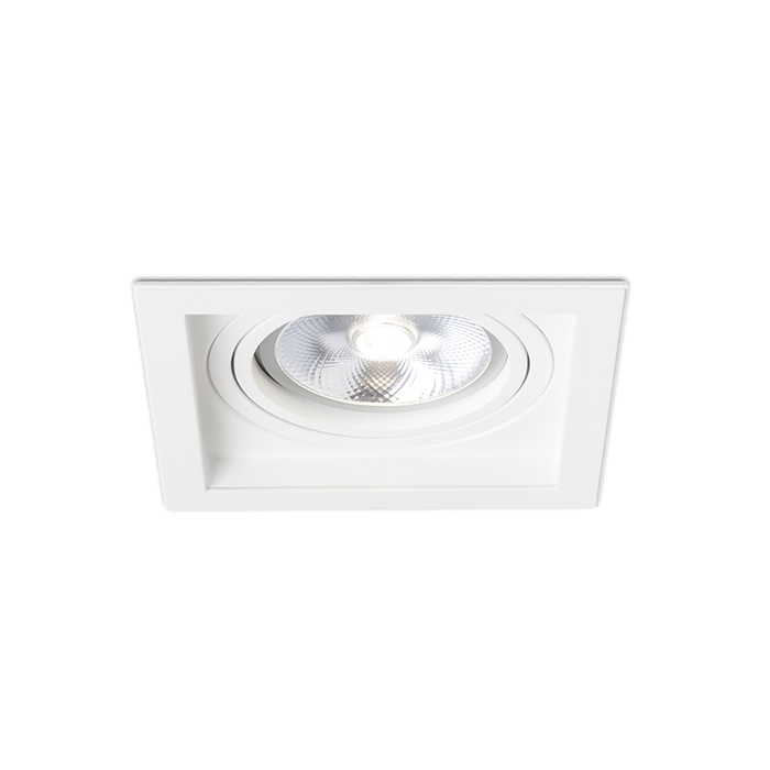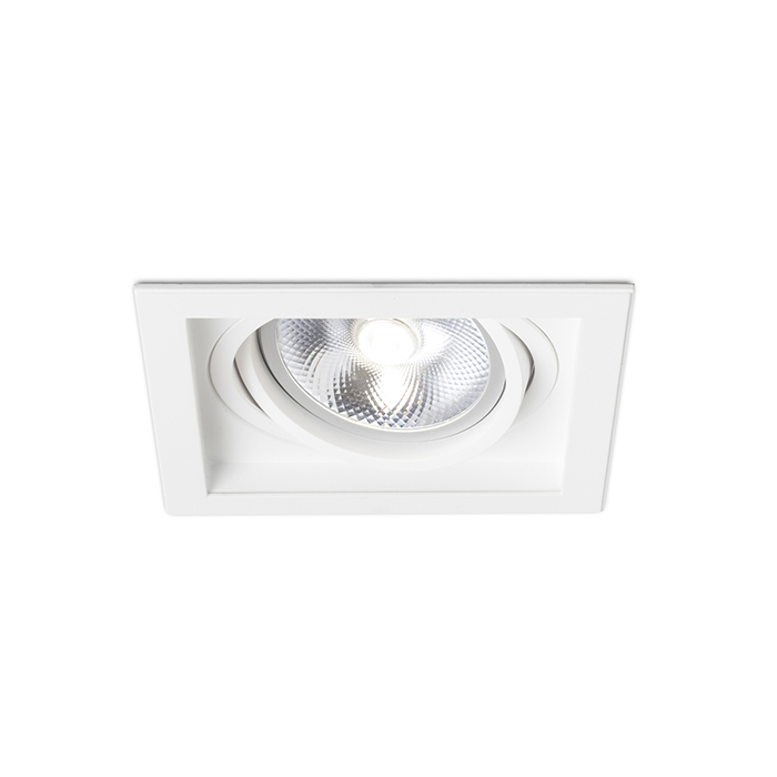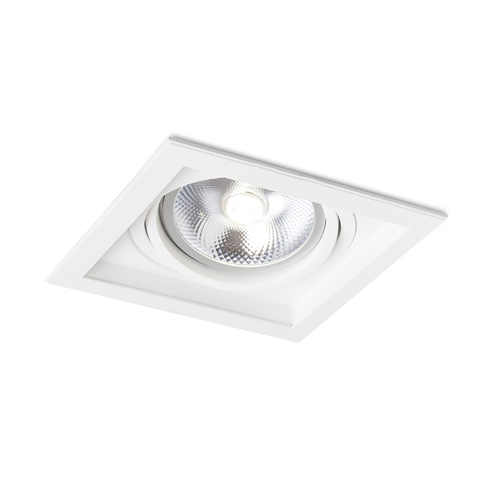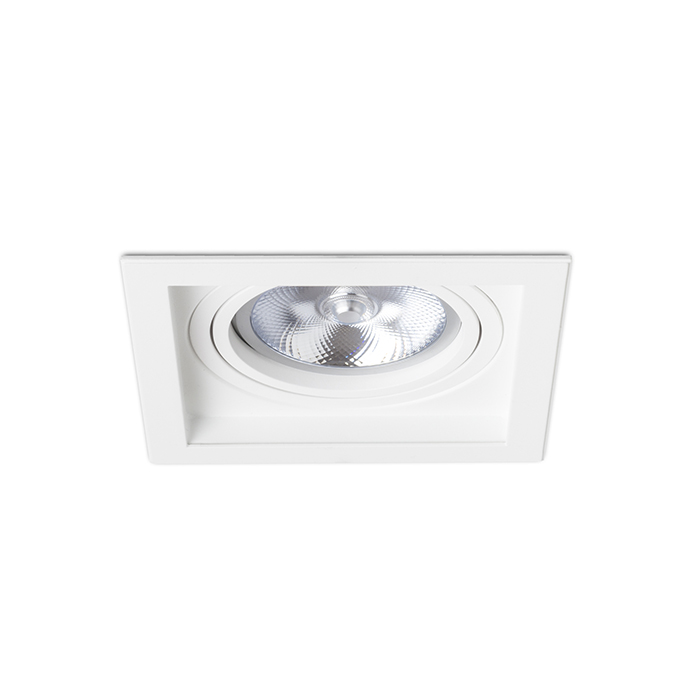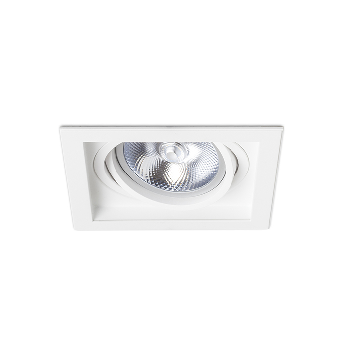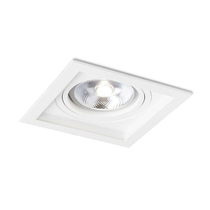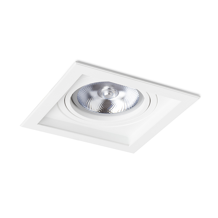 Négyzet alakú masszív alumíniumból készült süllyesztett lámpa festett kivitelben dönthetõ kialakítással AR111-es izzókhoz.