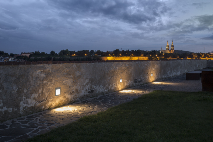 Kültéri süllyesztett lámpa, rozsdamentes acél kerettel, átlátszó üveggel. Az üveg látható méretei 11,8/11,5 cm.