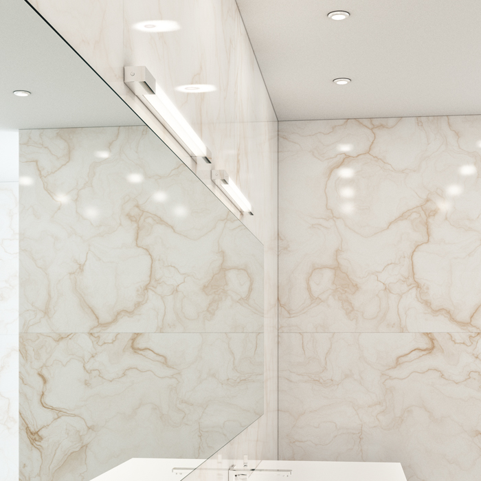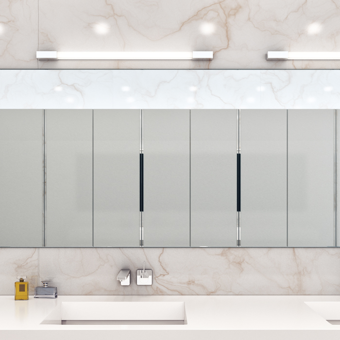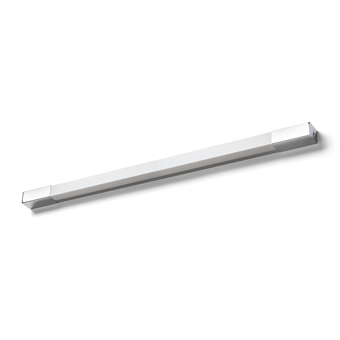 Falra szerelhető, lineáris LED-es fürdőszoba lámpa króm záróelemekkel. Alkalmas párás környezetben való használatra.