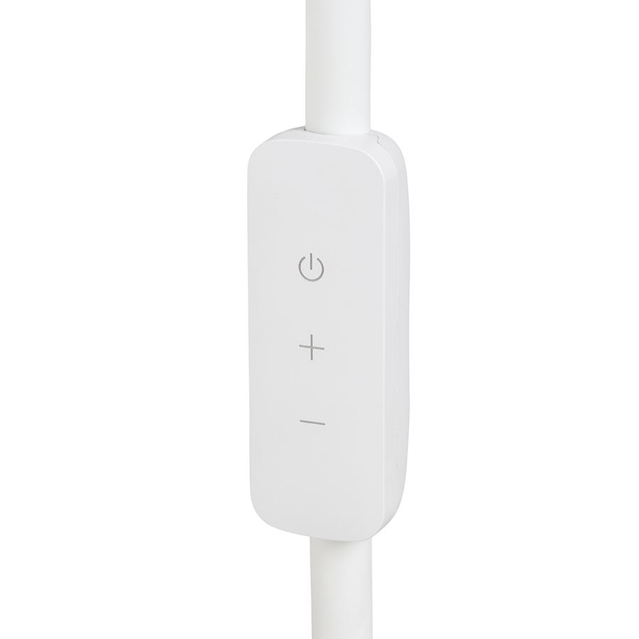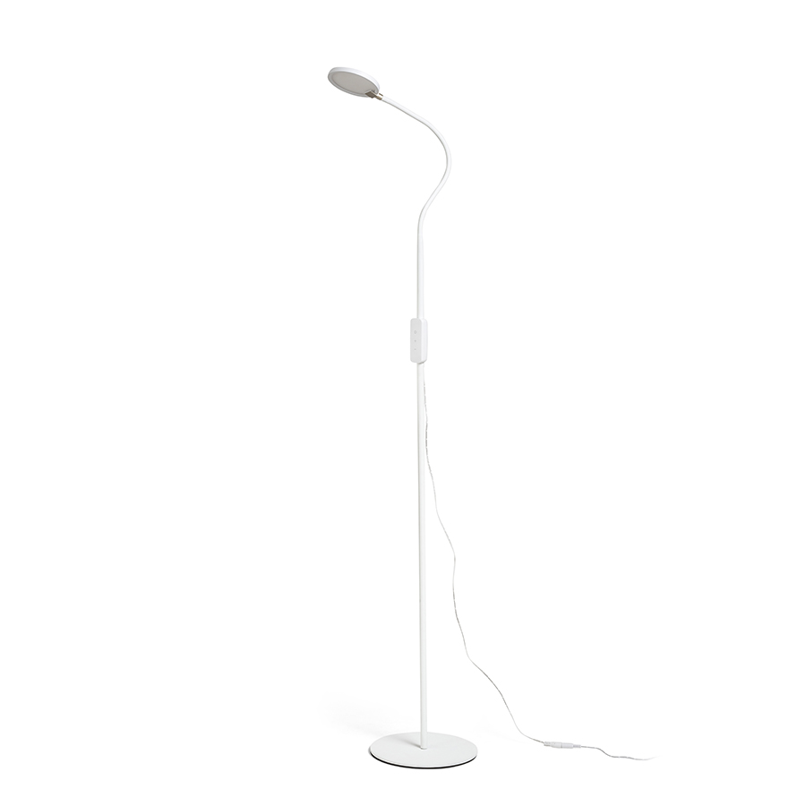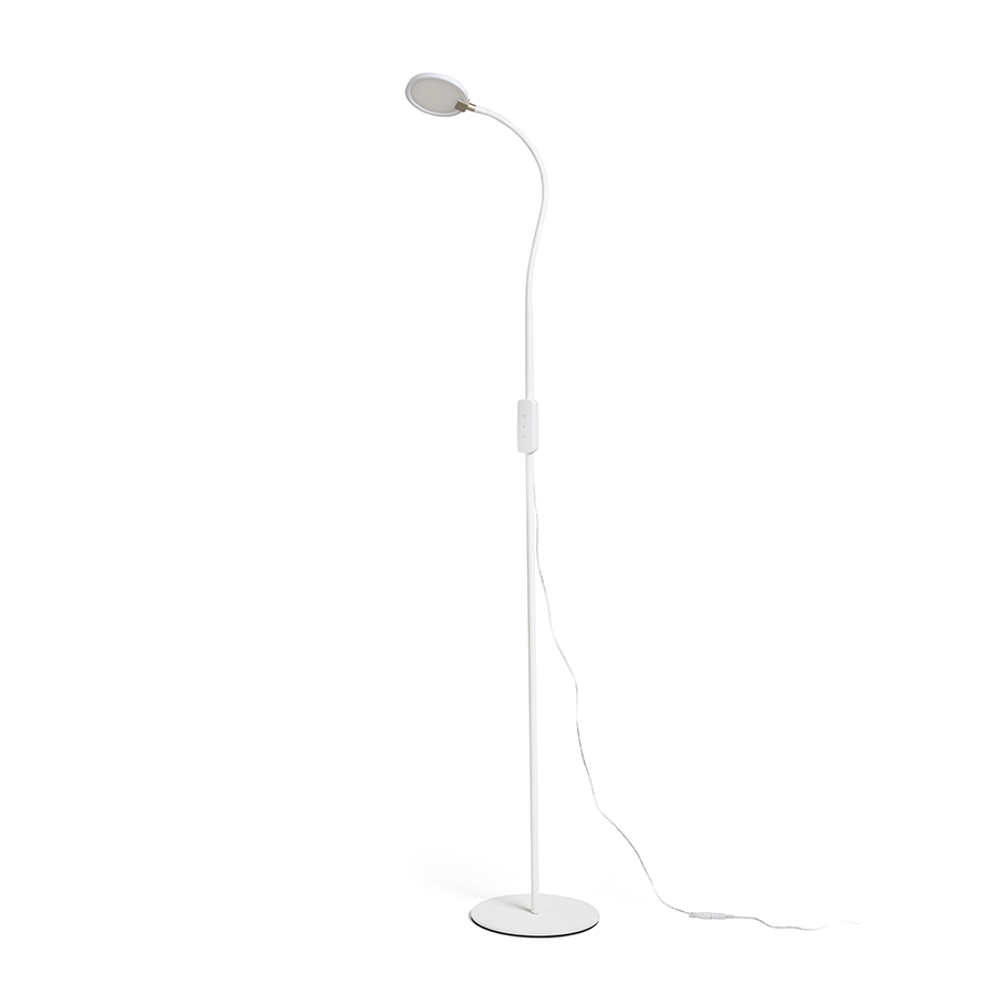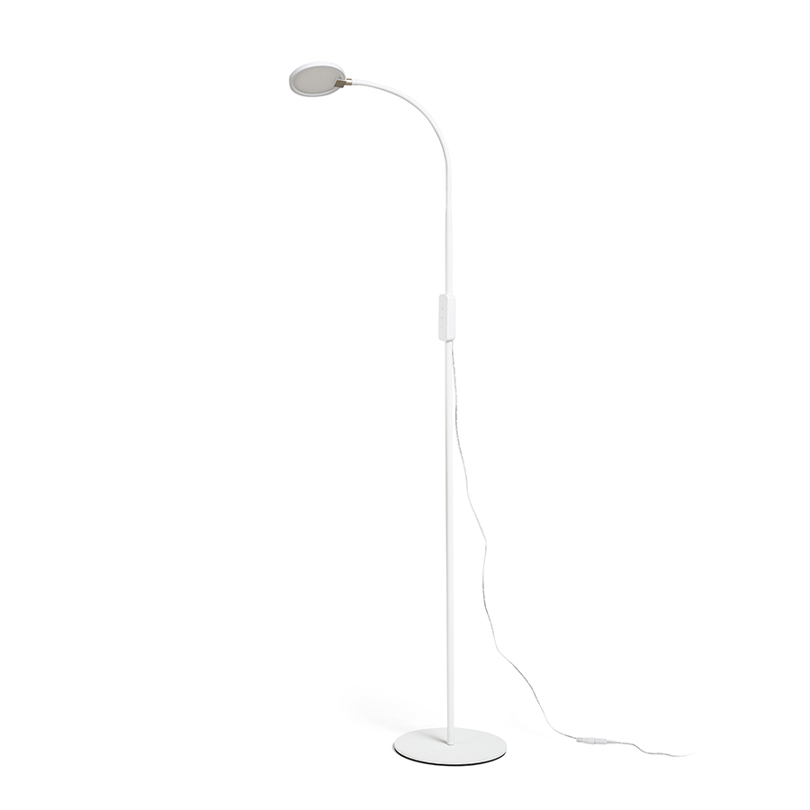 LED állólámpa hajlékony nyakon, kör alakú fényvisszaverővel, amely tejszerű diffúzorral van ellátva a szórt fény elérése érdekében. A kapcsoló a talpon található.