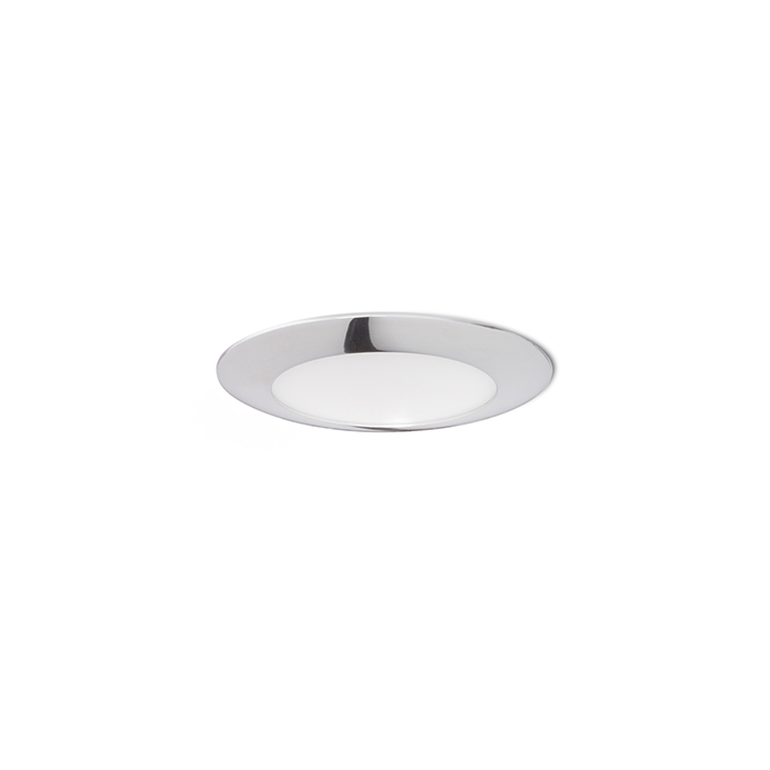 Kerek, süllyesztett LED lámpa gipszkarton mennyezetekhez, lekerekített kerettel és alacsony süllyesztési mélységgel.