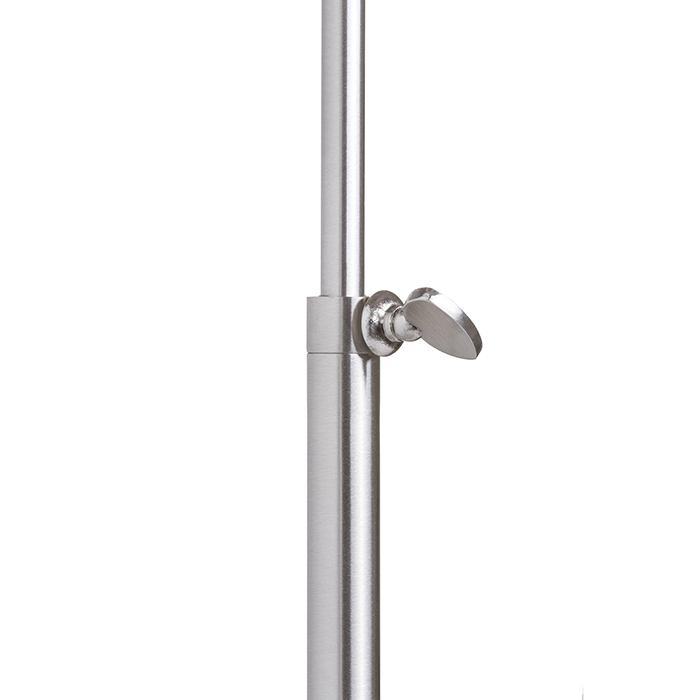 Asztali nikkel lámpa, teleszkópos lábbal és textil lámpaernyővel E27-es foglalatra rögzítve.