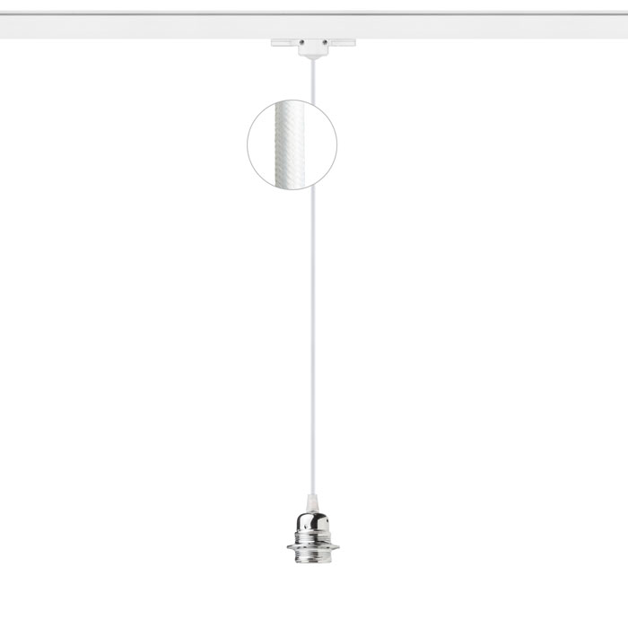 Textil kábel különböző színkombinációkban E27-es fém foglalattal, dekoratív izzóval vagy egy alkalmas lámpabúrával használható. Háromáramkörű sínre való adapterrel.