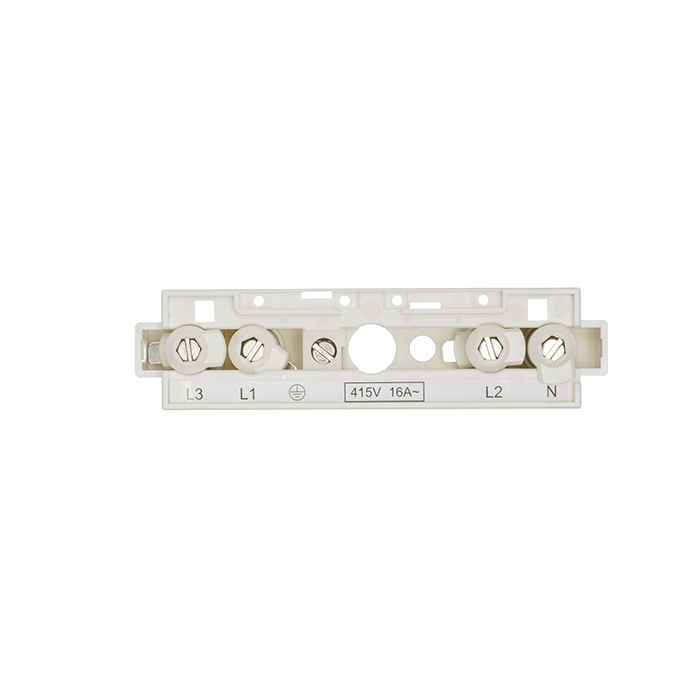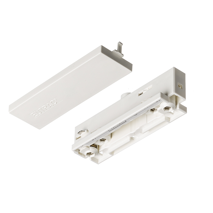 Átvezető tápcsatlakozó háromáramkörös EUTRAC sínhez, a sín felosztása nélkül. Maximális terhelés 16A.