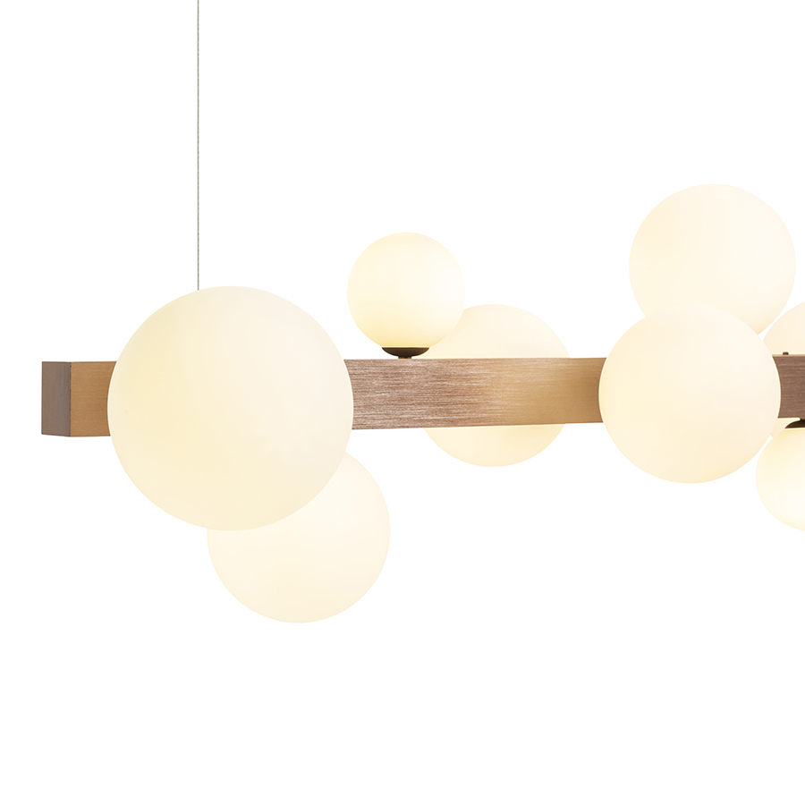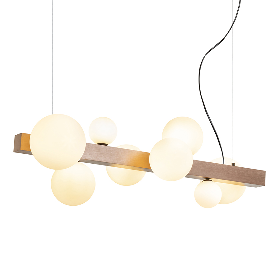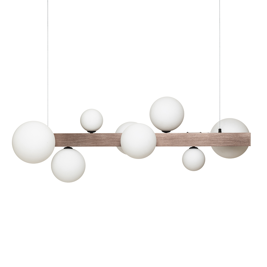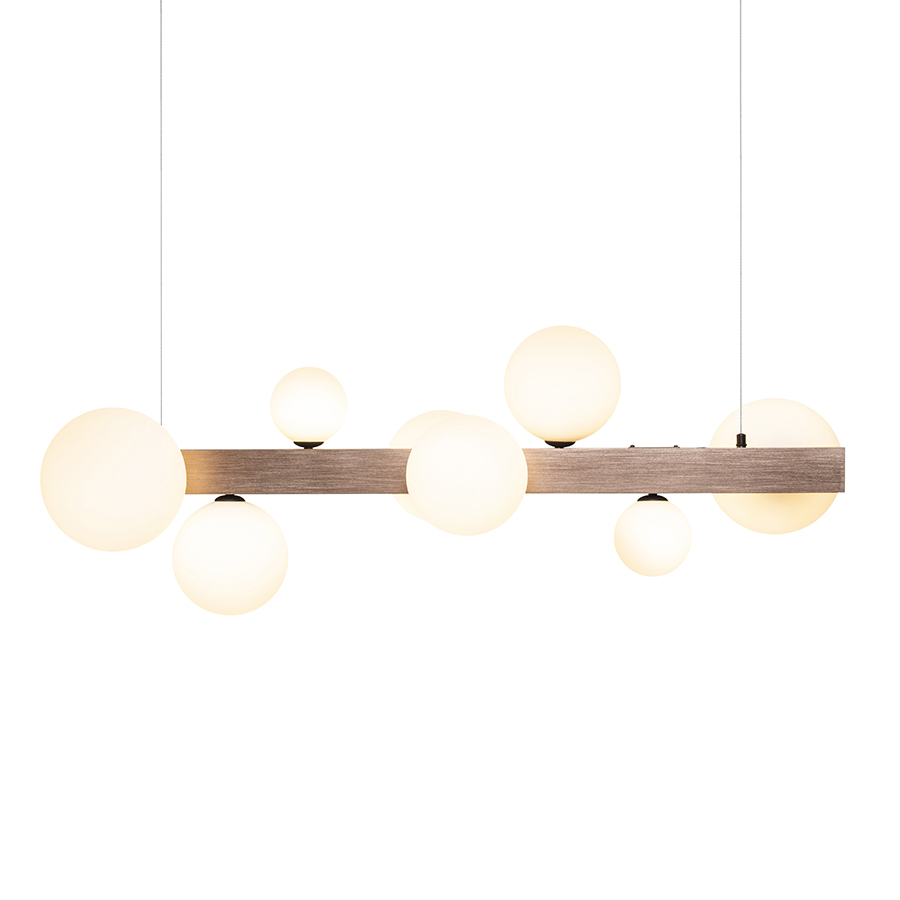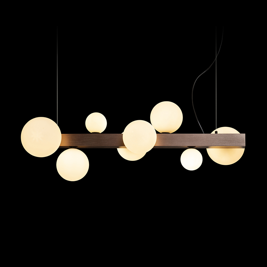 Design függőlámpa nyolc üvegbúrával, három különböző méretben. Az üvegbúrákat csiszolt bronzszínű fém prizmára szerelték. Alkalmas G9 foglalattal rendelkező LED fényforrásokhoz.