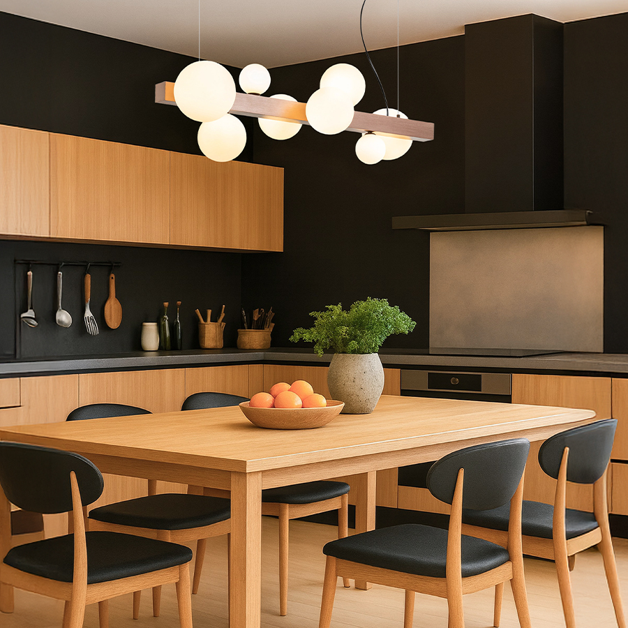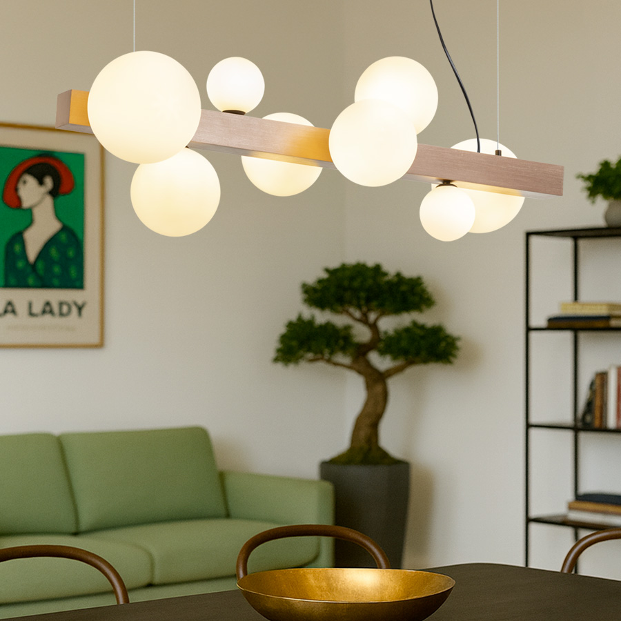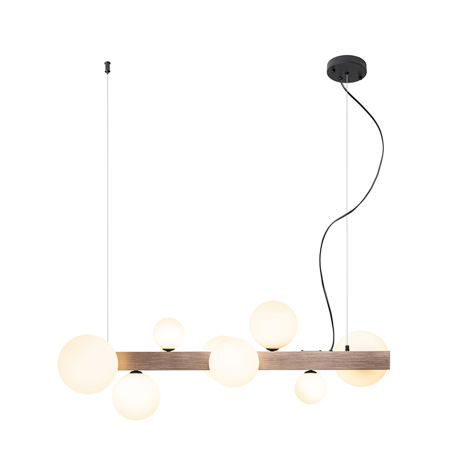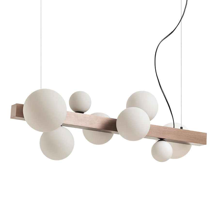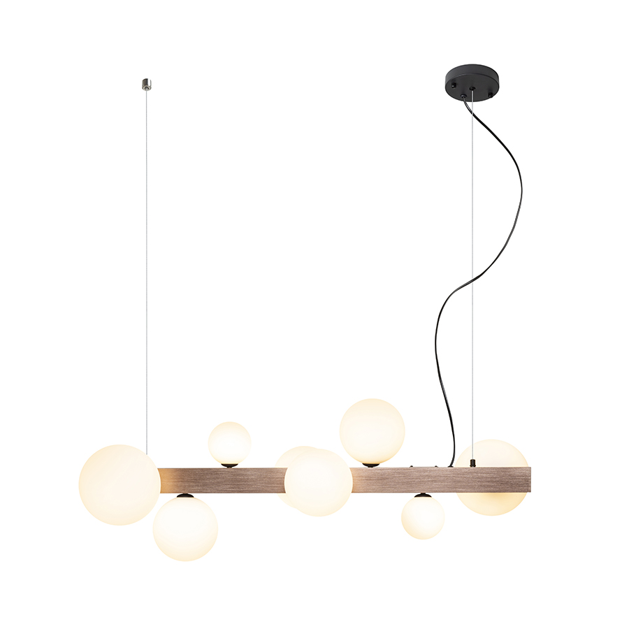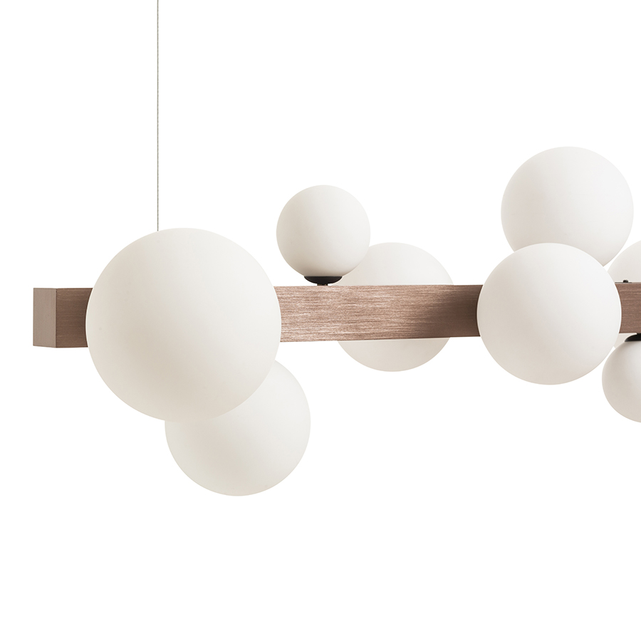 Design függőlámpa nyolc üvegbúrával, három különböző méretben. Az üvegbúrákat csiszolt bronzszínű fém prizmára szerelték. Alkalmas G9 foglalattal rendelkező LED fényforrásokhoz.