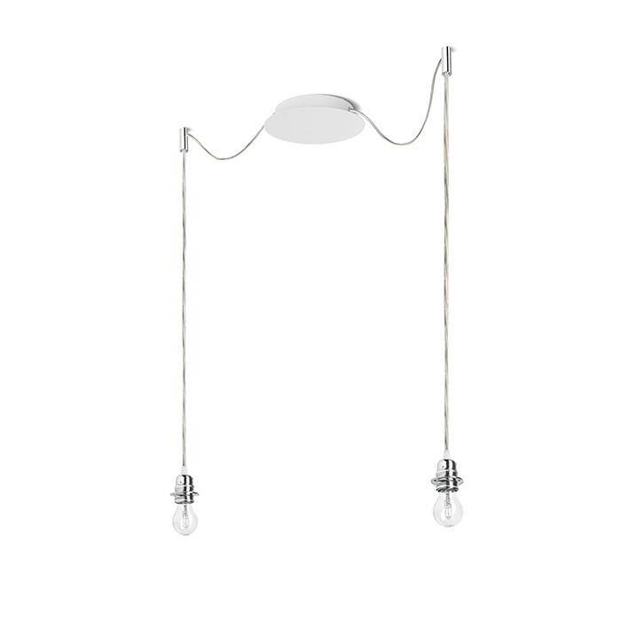 Függőlámpa központi mennyezeti alappal és különálló textil karokkal E27 fém foglalattal. A zsanérok króm mennyezeti tartókkal vannak felszerelve, amelyeket az alaptól külön-külön választott távolságra lehet elhelyezni. A kábel teljes hossza 3 m. Alkalmas lámpabúrák: ARISTA, DELI, JAKARANDA, DOUBLE 40/30, DOUBLE 55/30, ASPRO 40/30, ASPRO 55/30, RON 15/20, RON 40/25, RON 55/30, TEMPO 15/30, TEMPO 30/19.