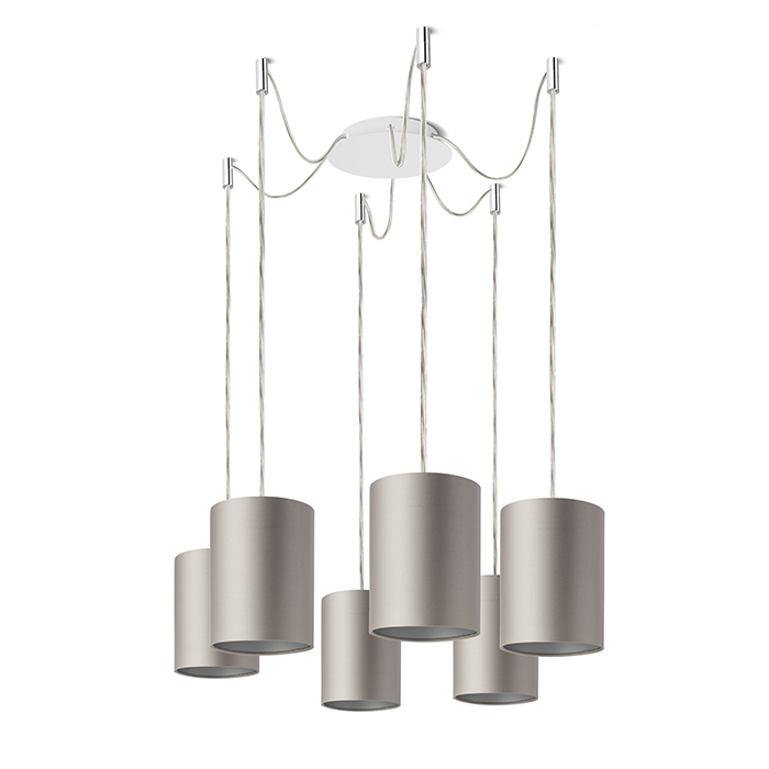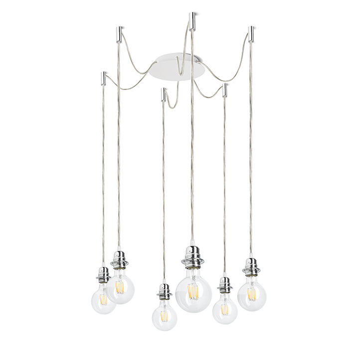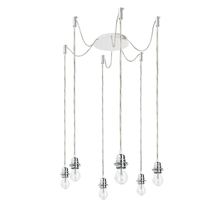 Függőlámpa központi mennyezeti alappal és hat különálló textil függesztékkel, fém E27-es foglalattal, dekoratív izzók vagy megfelelő textil lámpaernyők használatához. A függesztékek krómozott mennyezeti rögzítőelemekkel vannak ellátva, amelyek egyénileg választható távolságra helyezhetők el az alaptól. A kábel teljes hossza 3 méter.