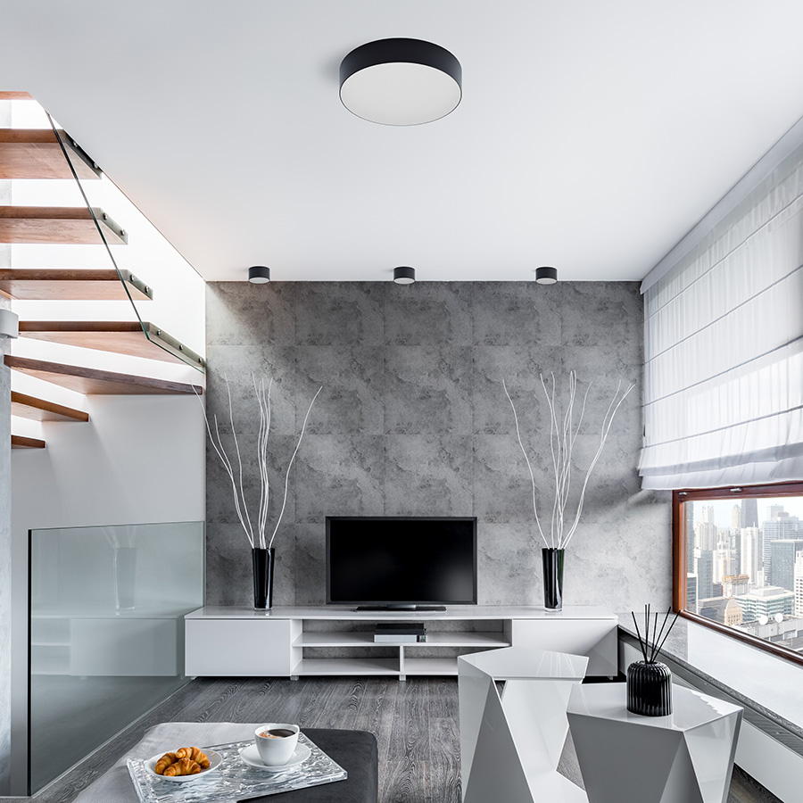 Mennyezeti, kör alakú LED lámpa minimalista kerettel.