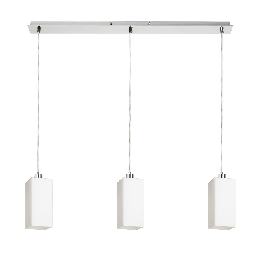 Egy függő lineáris lámpa üvegernyőkkel, LED E27 fényforrásokhoz. Alkalmas étkezőasztal fölötti elhelyezésre.