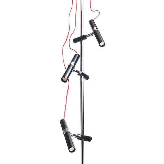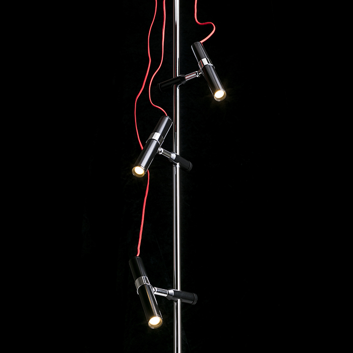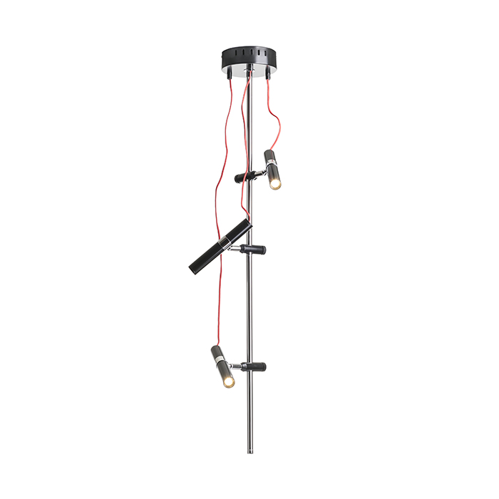 Elegáns kialakítású, króm mennyezeti lámpa, három fekete csúsztatható LED reflektorral és piros textil kábellel.