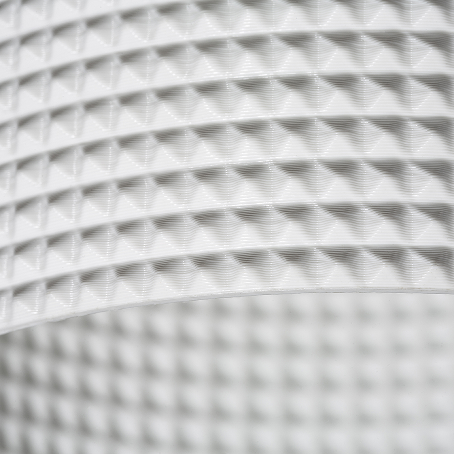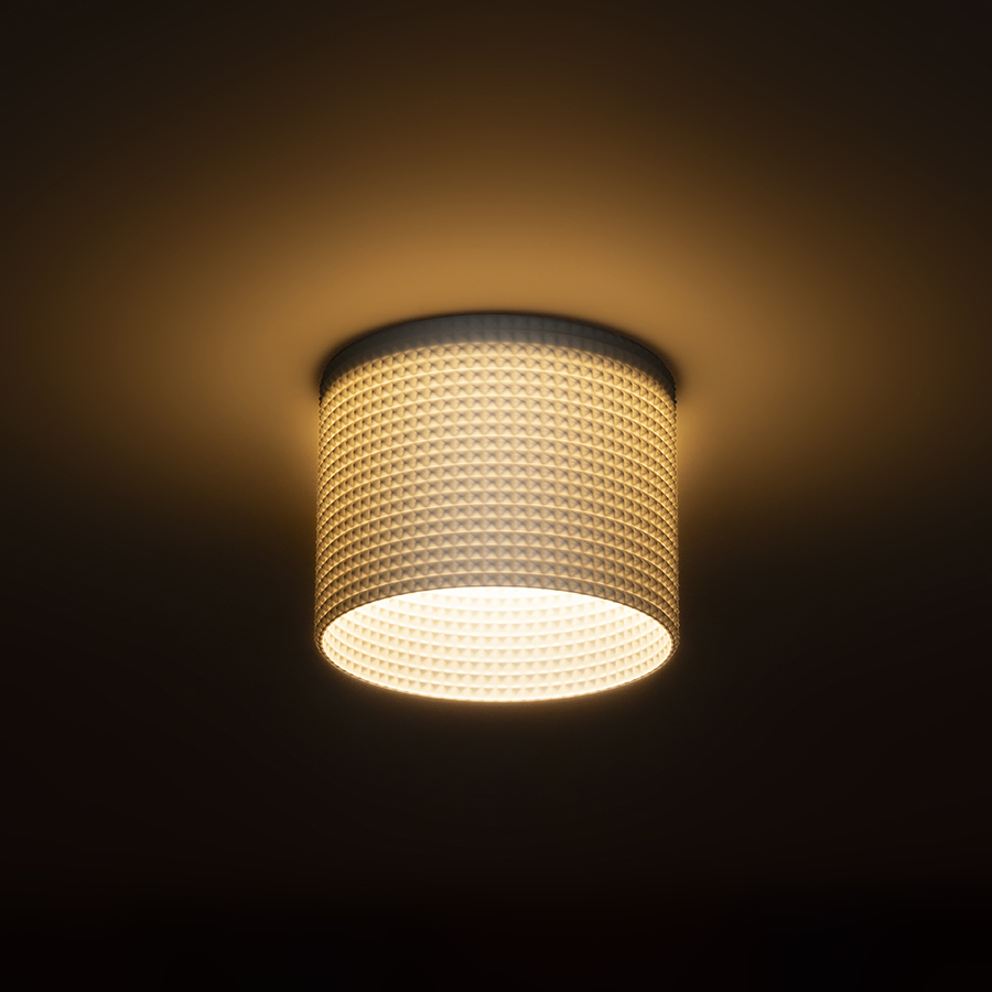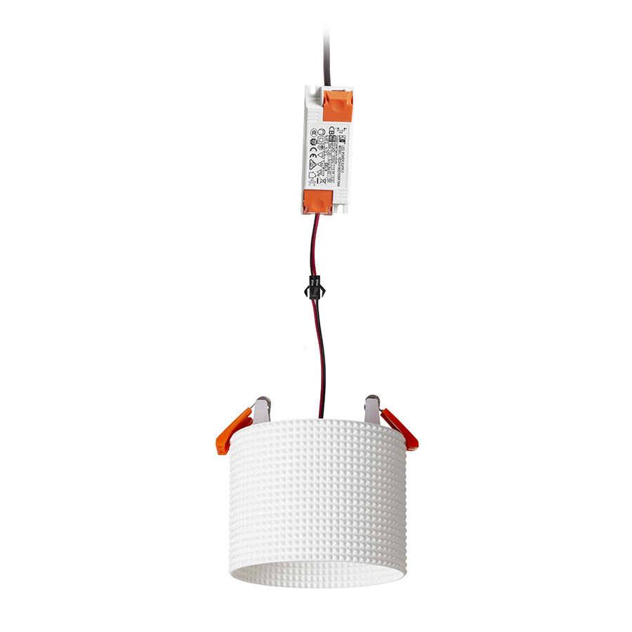 Alacsony beépítésû vakolt mennyezetbe szánt LED lámpa dekoratív lámpabúrával. Az búrát 3D nyomtatással készítették. Környezetbarát PLA anyagból készült mely teljesen lebomlik. A szerelõlyuk mérete a csúsztatható rögzítõ rugókkal állítható. A lámpa kényelmesen kicserélhetõ a meglévõ halogén lámpák helyett anélkül hogy módosítani kellene a szerelõlyukakat.