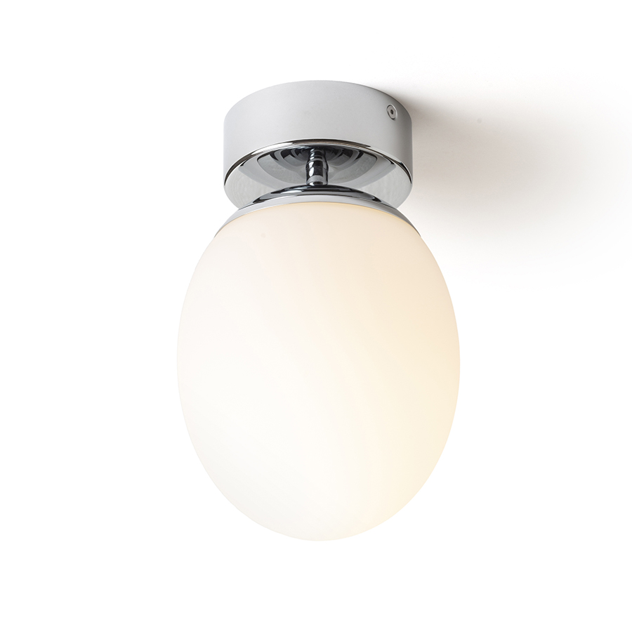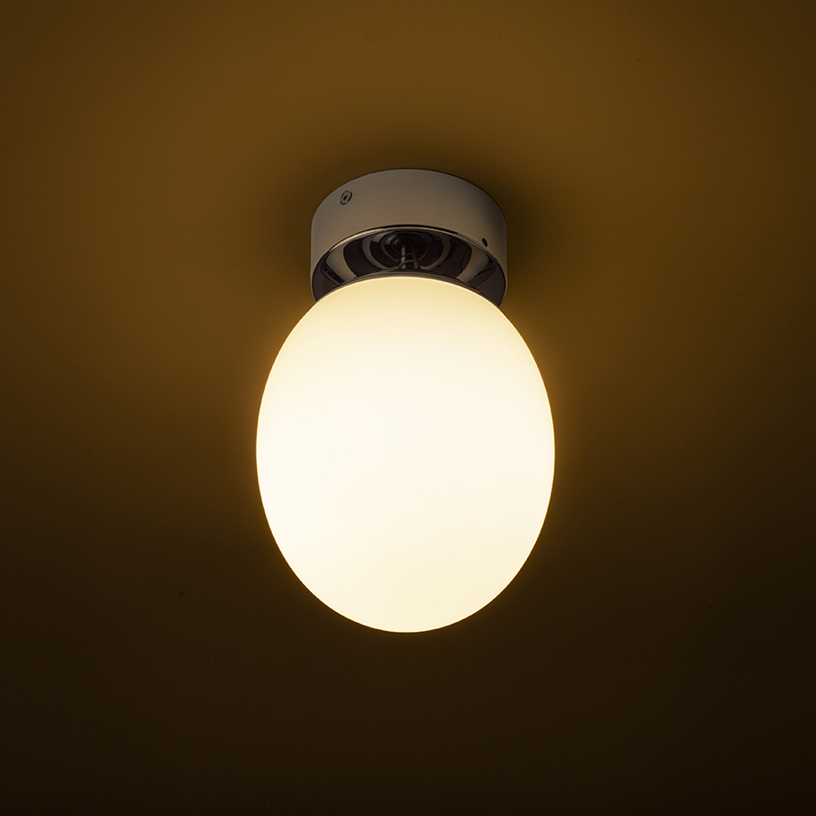 Ovális üveg mennyezeti lámpa króm talppal nedves környezetben alkalmazható.