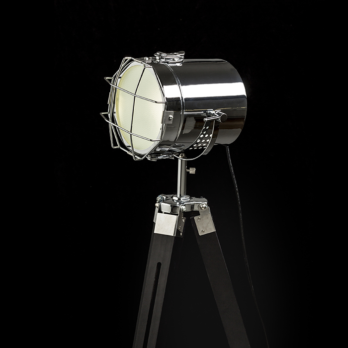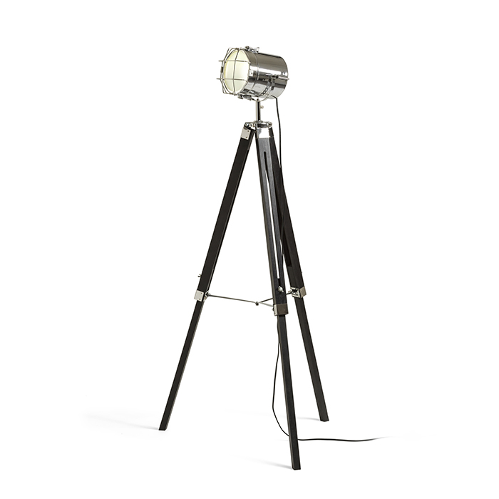 Retro állólámpa fa háromlábú állványon állítható reflektorral E27 foglalatú fényforráshoz.