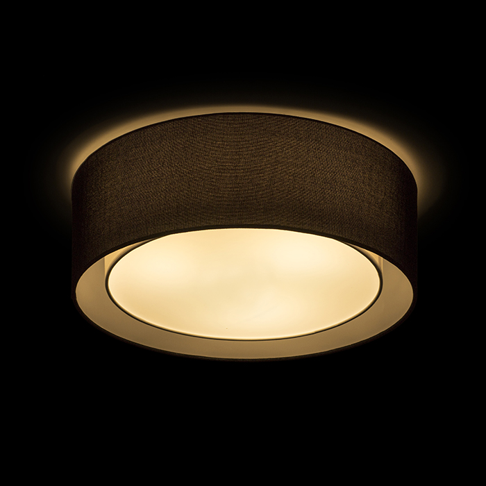 Mennyezeti dupla kör alakú textil lámpa három E27 fényforráshoz. A belsõ búra minden esetben fehér színben elérhetõ.