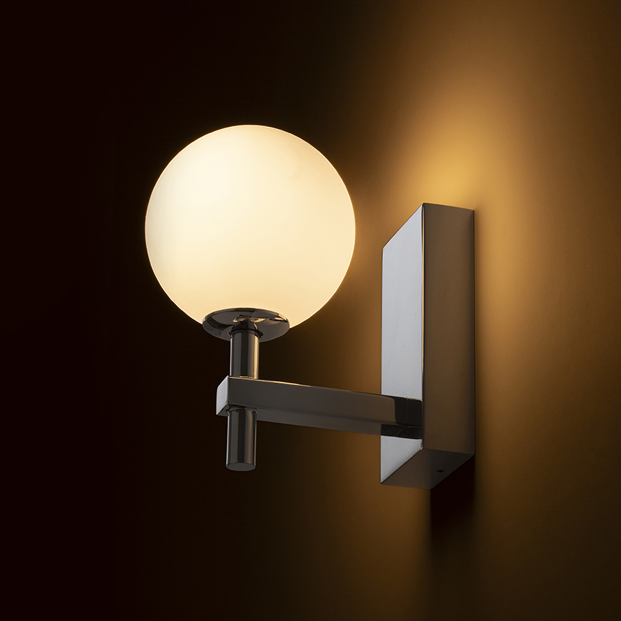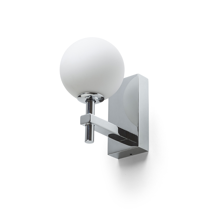 Fürdõszobai fali lámpa kerek opálüveg búrával krómozott talpon. G9-es foglalattal rendelkezõ LED fényforrásokhoz alkalmas.
