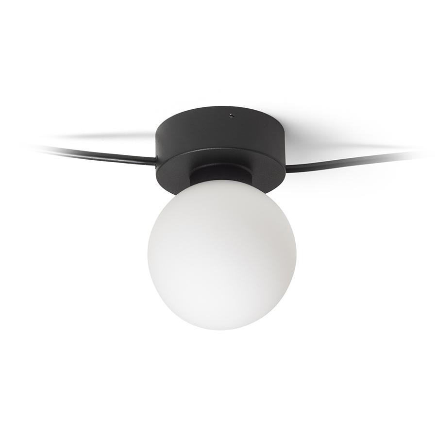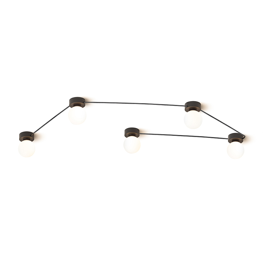 Fekete festett talapzaton elhelyezett üvegárnyékolóval ellátott mennyezeti vagy fali lámpák amelyek fekete kábelekkel egy vonalban vannak összekötve. A lámpák az Ön elképzelése szerint csoportosíthatók. Alkalmas G9 foglalattal rendelkezõ LED fényforrásokhoz.