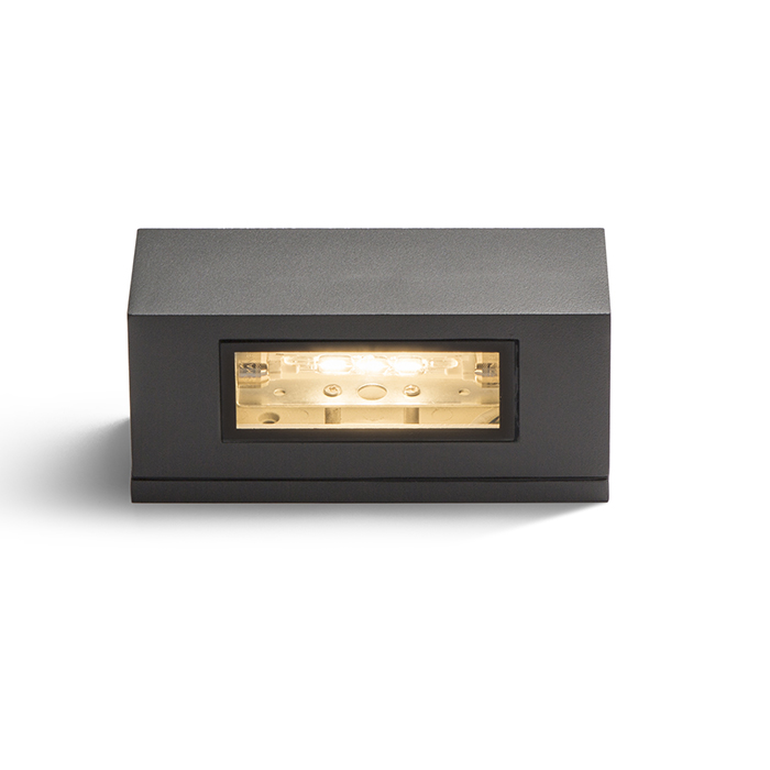 Falra szerelhetõ kültéri lámpa FEL/LE világítással. A lámpa egyik oldala átlátszó fekete kerettel ellátott üveg. A lámpa másik oldala keskenyebb matt üveg.